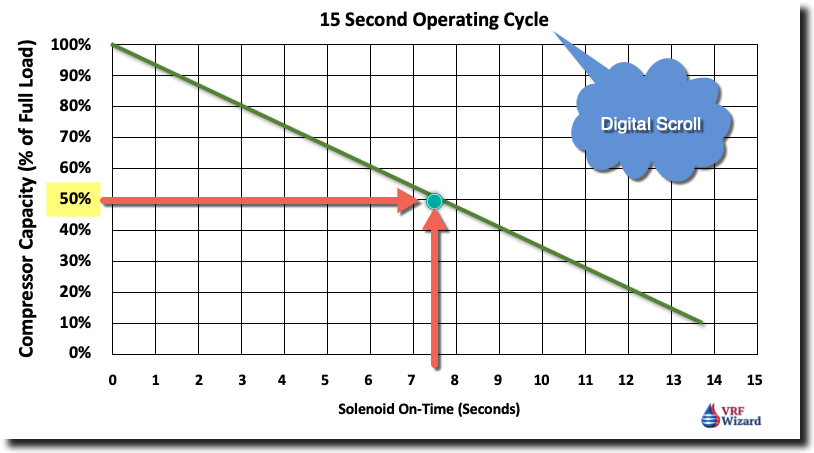 As the chart shows above, the longer the Solenoid Valve is on the less capacity the VRF compressor delivers. If the solenoid is open for 7.5 seconds, which equates to half the cycle time (15 sec.), then the compressor capacity is 50% (half).