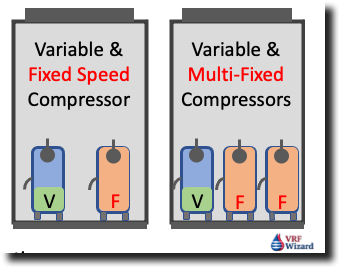 Various VRF Manufactures use a mixture of variable and fixed speed compressors in their outdoor units to handle the indoor unit demand. VRF manufactures may have two or more fixed speed compressors with one variable speed compressor.